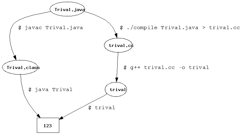 $ compile Trivial.java > trival.cc $ g++ trival.cc -o trival $ trival 123